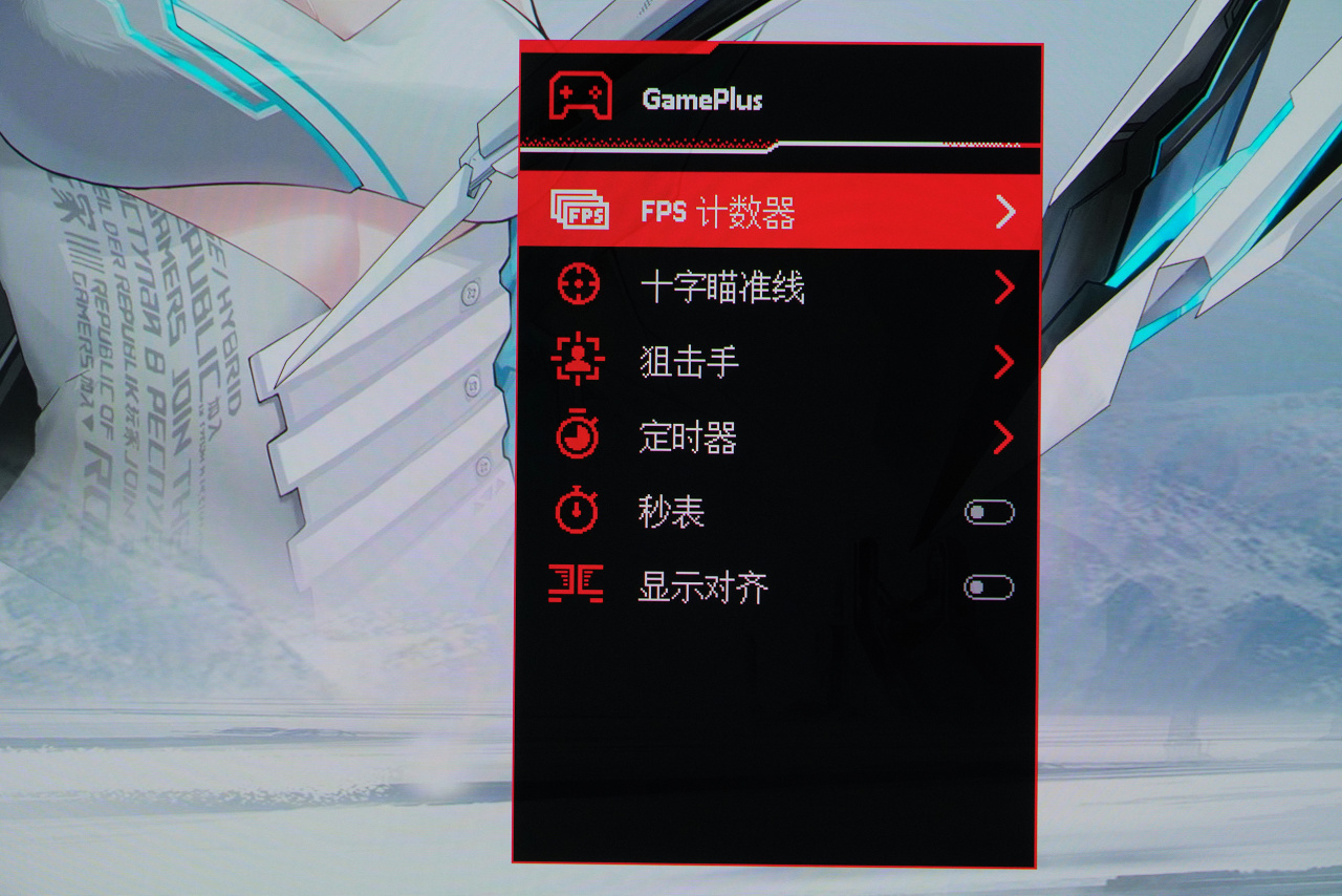 作爲電競顯示器,ROG絕神27PLUS在遊戲輔助方面也有自己的一套,通過顯示器背後的快捷鍵就可以一鍵選擇遊戲輔助功能。