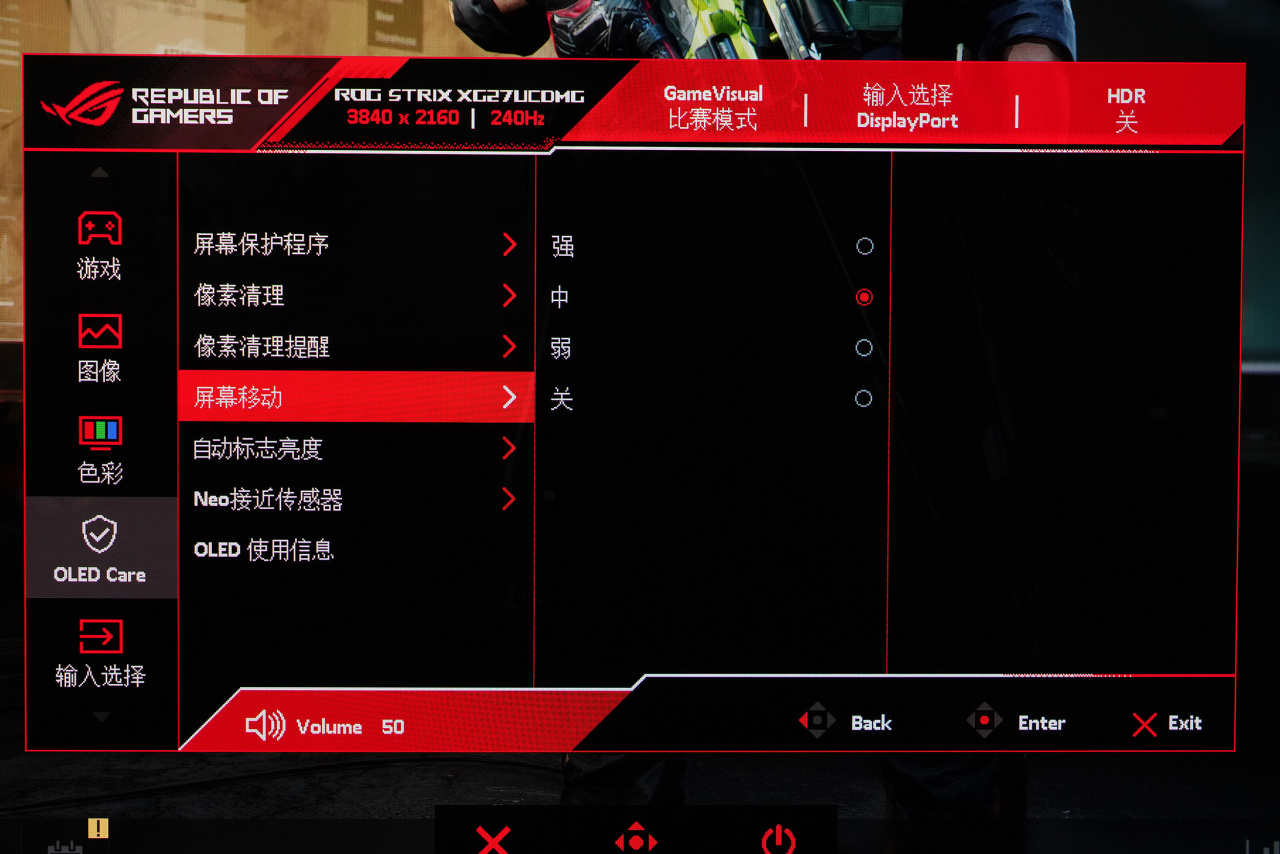 介紹完這塊屏幕在我玩遊戲時的體驗,接下來看看OSD裏的屏幕保護功能。上面提到了OLED自發光的顆粒使得屏幕雖然在明暗對比度、響應時間等方面堪稱無敵,但是它也有一個繞不開的問題:當屏幕長時間顯示同一個畫面時,通電發光的有機材料老化速度加快,導致發光率下降和顏色偏移,也叫燒屏。這是OLED材質的特徵,母胎自帶的一個小缺陷,好在可以通過一些方式來極大地降低燒屏的可能,例如: