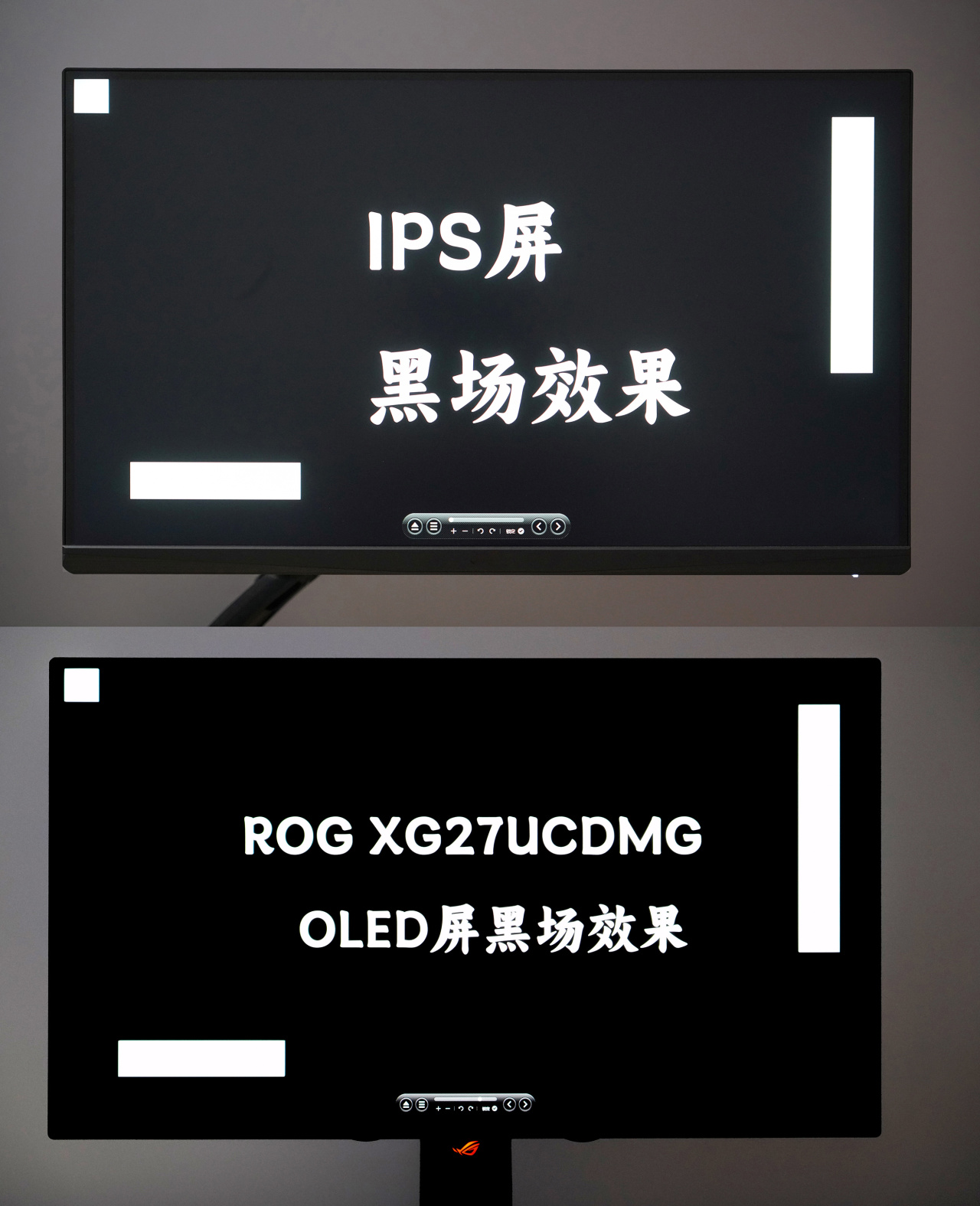 下圖是我的一臺IPS屏幕的顯示器與絕神27PLUS屏幕的對比。可以看到IPS屏即便在純黑色的位置也略微泛白,這是因爲發光顆粒背後的背光燈保持着開啓,特別是晚上關燈時這個泛白還是非常明顯的。