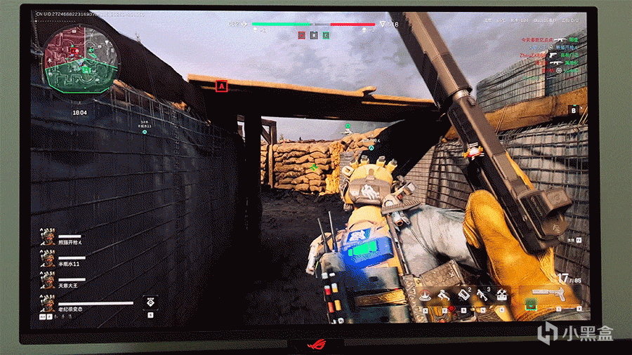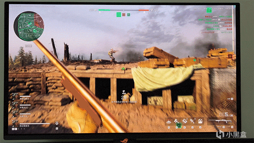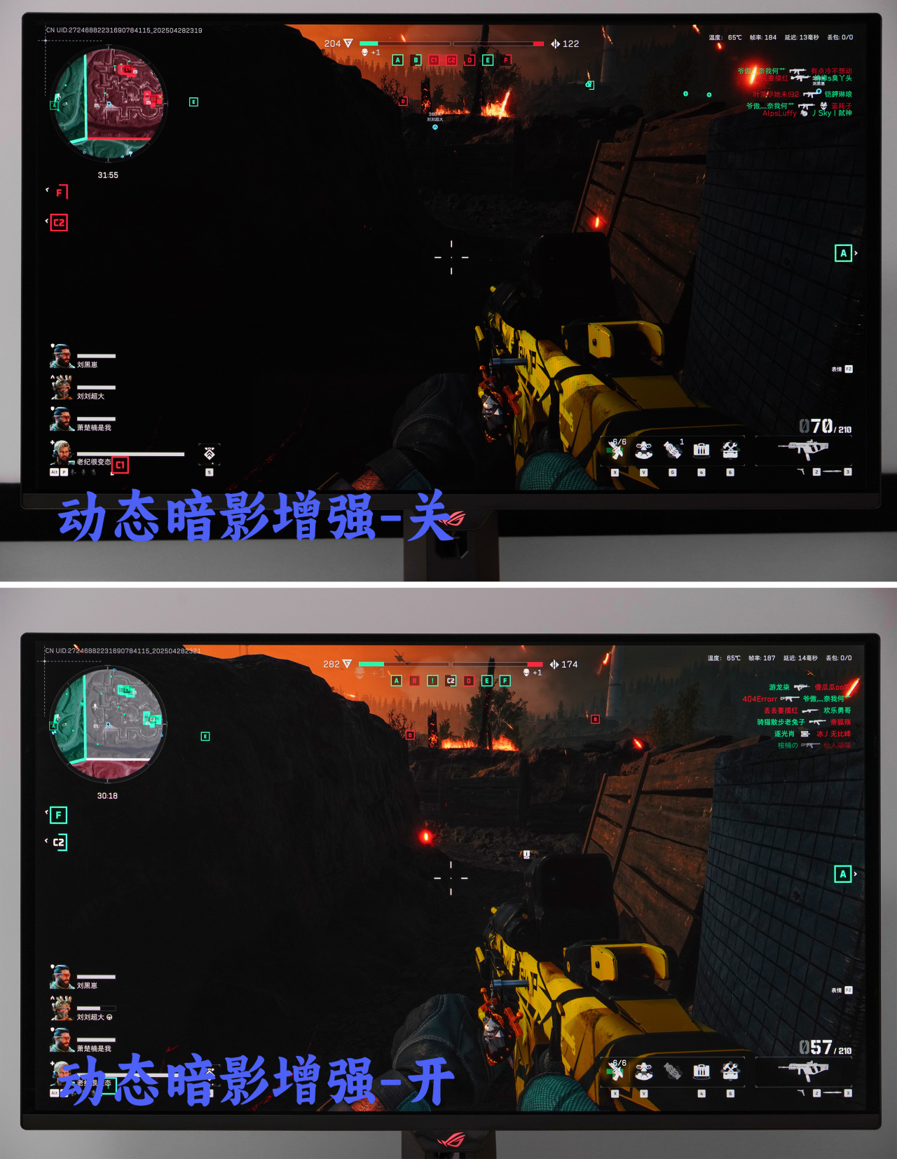 《三角洲行動》大更新後推出了夜間戰場,在塹壕裏行動時基本是看不清的。下圖中的上半張就是原始畫面,我經常被壕溝角落裏趴着的人陰死。而在絕神27PLUS的OSD裏開啓Shadow Boost動態暗影增強功能後,可以看到遊戲暗部區域更清晰可見(下半張),右側的木板、掩體也都更清晰了,而且左側戰壕坑坑窪窪的細節也能看清,想在角落裏陰我可不那麼容易了。