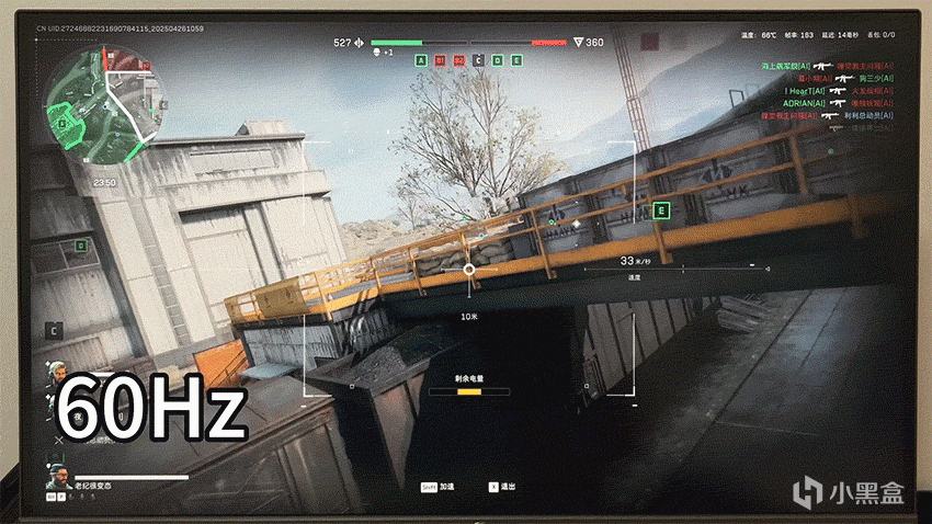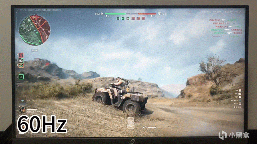 高刷新率可以說是一臺電競顯示器的核心,它意味着顯示器的畫面一秒鐘可以切換畫面多少次,切換的次數越多畫面過度越流暢。下圖是30Hz,聽起來一秒鐘30個畫面好像還可以,但是在慢動作下,可以明顯看到車輛腳下山坡處的畫面頓挫感非常強烈,而在真實遊戲體驗時,30Hz的畫面動起來非常模糊,很難看清場景。