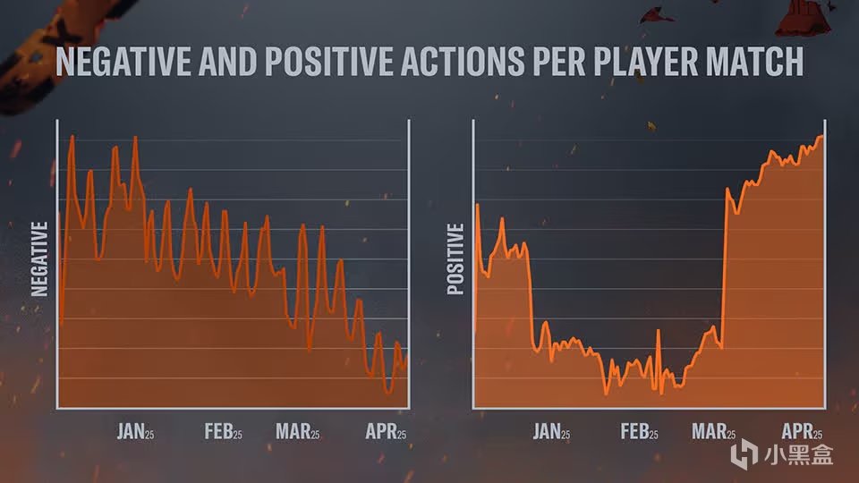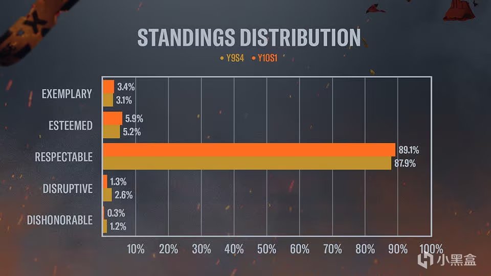 隨着名譽等階分佈的變化,許多遊戲內行爲都得到了改善。以下是一些統計數據,顯示了伴隨名譽系統的全面發佈,Y10S1中的行爲產生的具體變化。