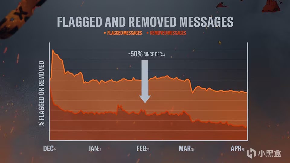 我們的自動化文字聊天審覈系統正幫助減少遊戲中的惡劣行爲。自上線以來,即使整體消息發送量增加,被刪除和標記的消息比例已下降50%(見下方圖表)。每月分析超過2億條文字聊天信息,其中不到1%被刪除,不到2%被標記。