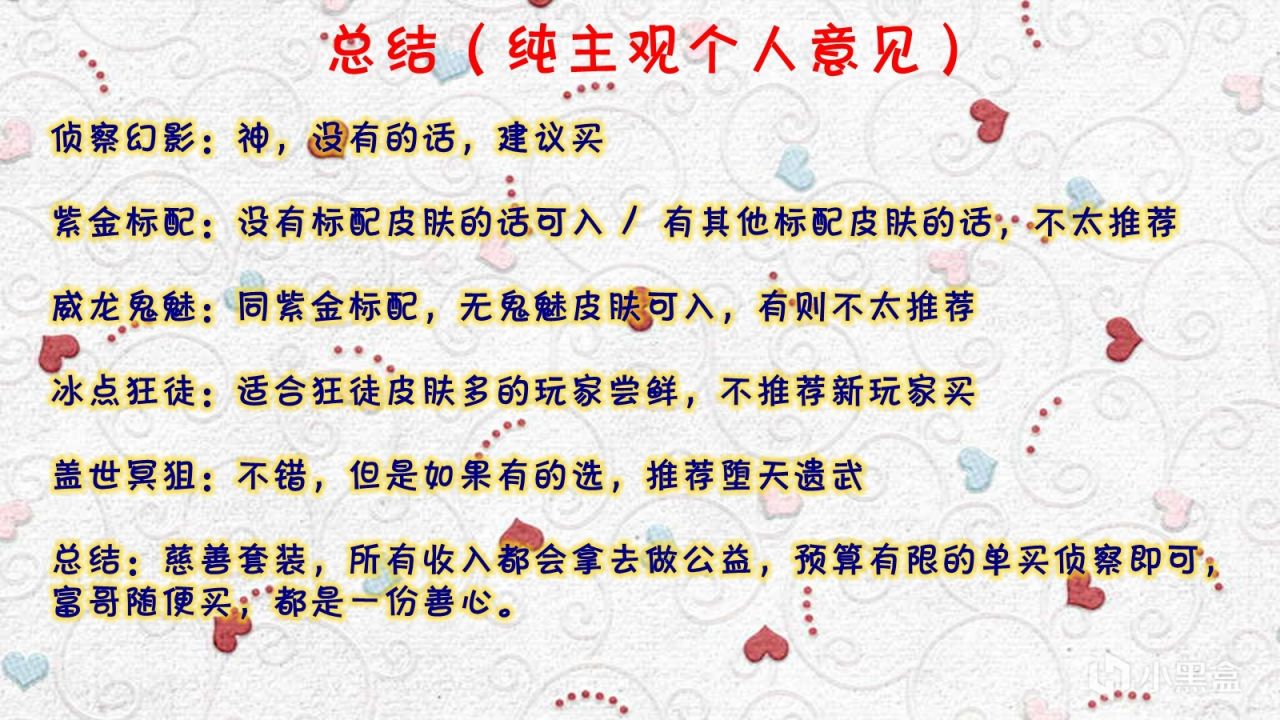 雖然套裝裏面加入了五十塊錢的噴漆卡面掛飾噁心玩家,但這次是慈善套裝,就不吐槽了。考慮到慈善屬性,只能說量力而行,有實力的可以全套買。這活動我的理解是:偵察幻影返場15天,對於苦等偵察幻影的玩家來說,有福了,還能順手做個慈善。祝大家遊戲愉快,曼波。