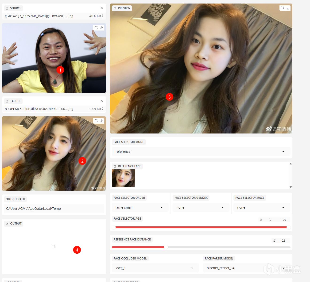 中間區域,1是來源,你想要替換的人物圖片,2是目標,被替換的圖片或視頻,3是預覽替換的效果,4是開始運行後替換的結果