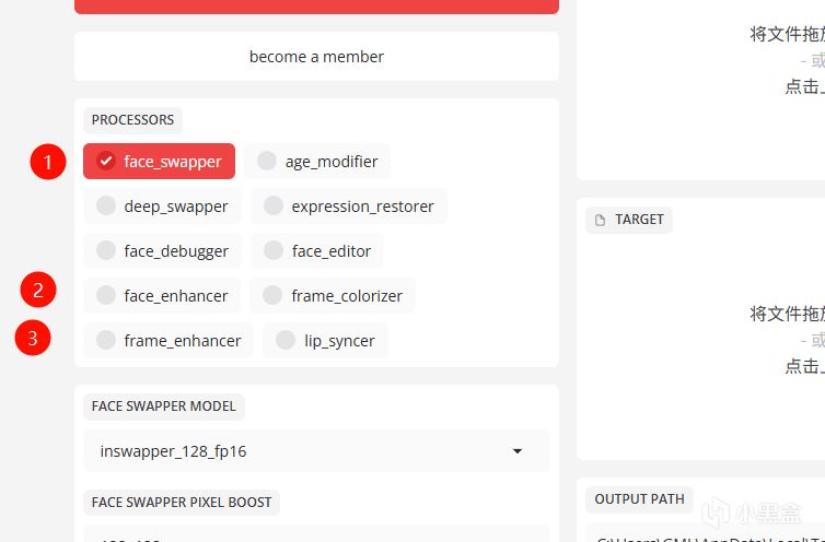 PROCESSORS部分這三個是最常用的。1是必選的,他是換臉模型,2是面部增強,3是幀增強