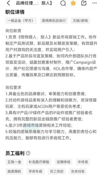 招聘強調“資深玩家”身份,認爲只有真正熱愛並長期沉浸於《怪物獵人》系列的“天尊老獵人”,才能設計出符合玩家期待的戰鬥系統、武器手感和共鬥體驗。