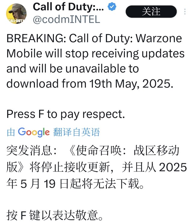 Activision 宣佈,《Call of Duty: Warzone Mobile》“COD 戰區手遊”將於2025 年 5 月 18 日之後停止在 App Store 與 Google Play 的下載及後續更新;已在該日期前安裝遊戲的玩家仍可繼續遊玩並保留跨平臺進度,但無法進行內購或收到更多內容更新,官方亦不會針對已購點數提供退款。
