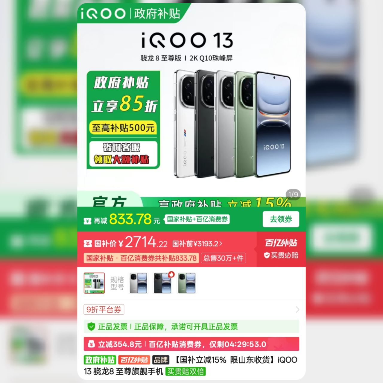 小注:昨天抖音商城的IQOO13价格更低,2600左右就能入手,但楼主文章拖更了一下,一觉醒来,活动结束了拼多多百亿补贴IQOO13 2714的价格达成目前是有条件的,只山东收货地址可享受该优惠。