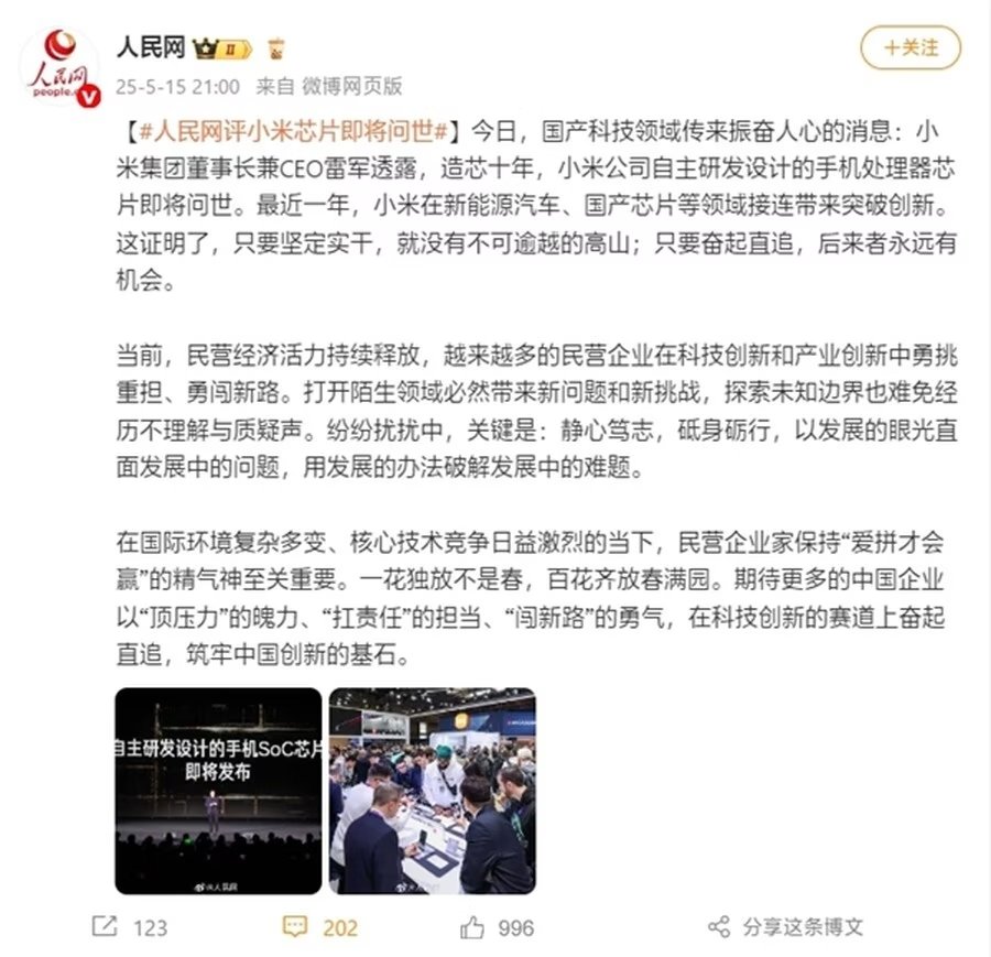 雷军此次宣布玄戒O1的发布,不仅是小米芯片研发历程中的一个重要里程碑,也标志着小米在高科技领域的不断突破和创新。为此,人民网还特意发文表示,“最近一年,小米在新能源汽车、国产芯片等领域的接连创新,证明了只要坚定实干,就没有不可逾越的高山。”