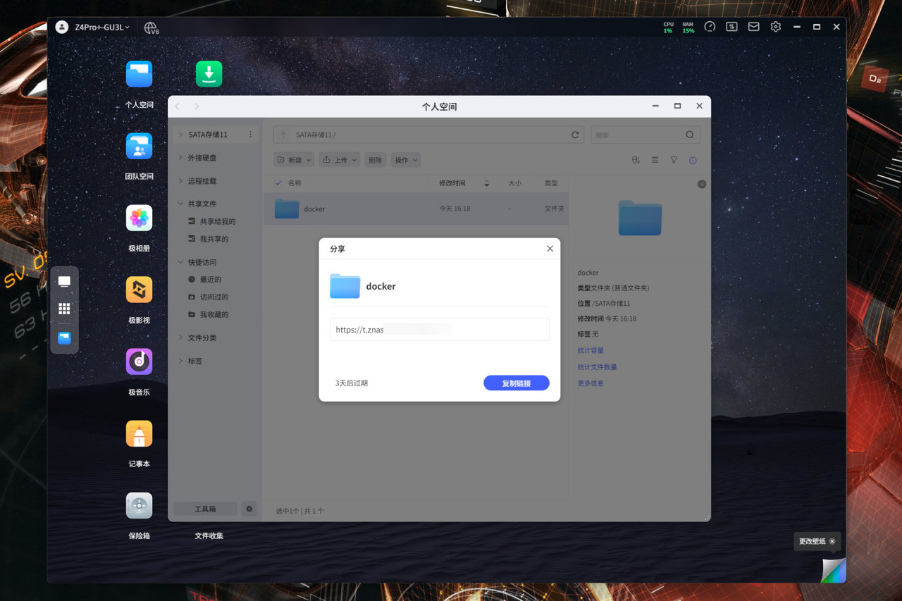 最後是文件共享,和絕大部分的NAS一樣,右鍵文件/文件夾即可創建分享鏈接,接收端不需要安裝客戶端就能查看或者下載文件。