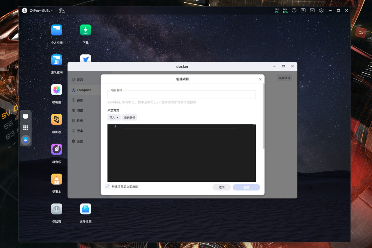 Docker和虛擬機功能各機型也無差,創建容器的相關功能保持一致,都支持Docker Compose導入和自定義加速地址等高階配置,這裏就不再贅述了。