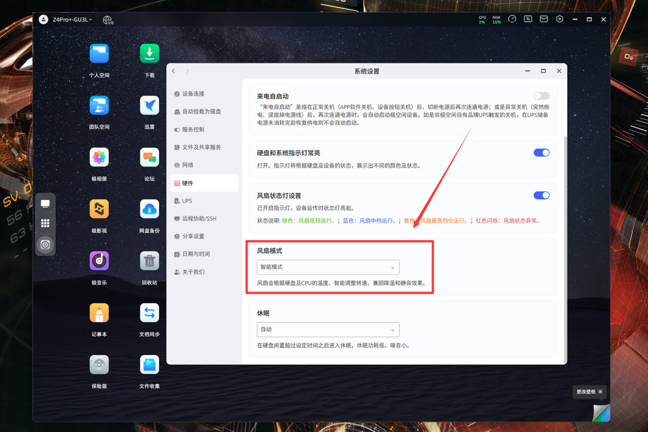 下面展示下極空間Z4Pro+的關鍵用料,確實比幾百塊的準系統NAS要強不少,首先是散熱系統,依舊是支持智能溫控的雙風扇,BIOS策略有做單獨優化,相比之前版本更靜音。