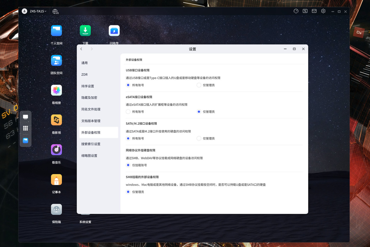 另外極空間現在支持硬件維度設置讀寫權限,也就是對USB外接設備、DAS限制訪問賬號,這個功能新老機型目前都支持。