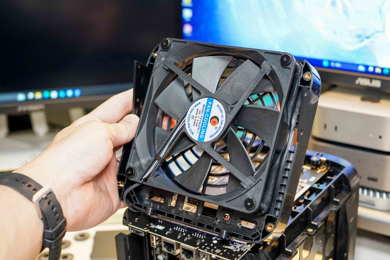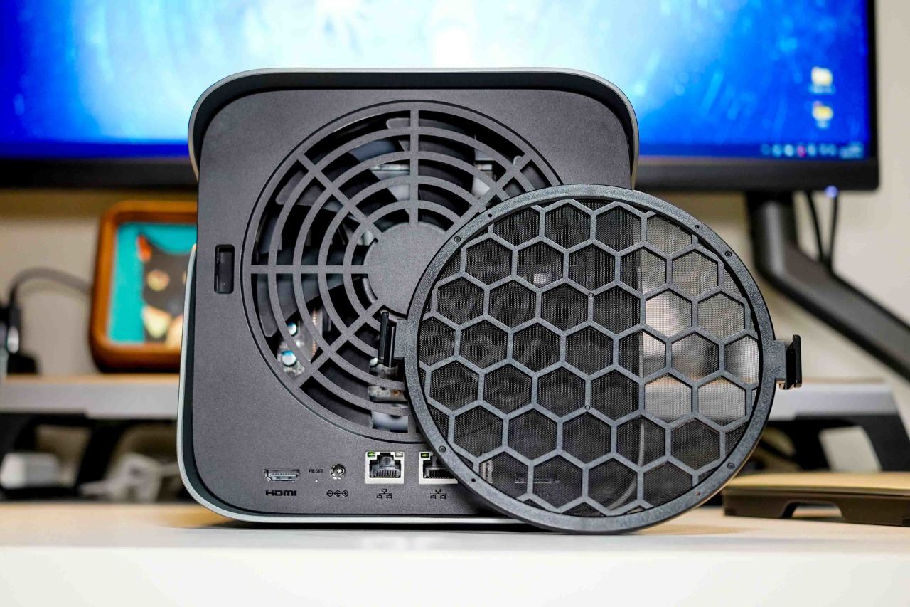 極空間Z4Pro+背面原裝有一張防塵網,通過卡扣固定在風扇外面,兩層式設計兼顧了風量和防塵能力,後期打理會比較方便。