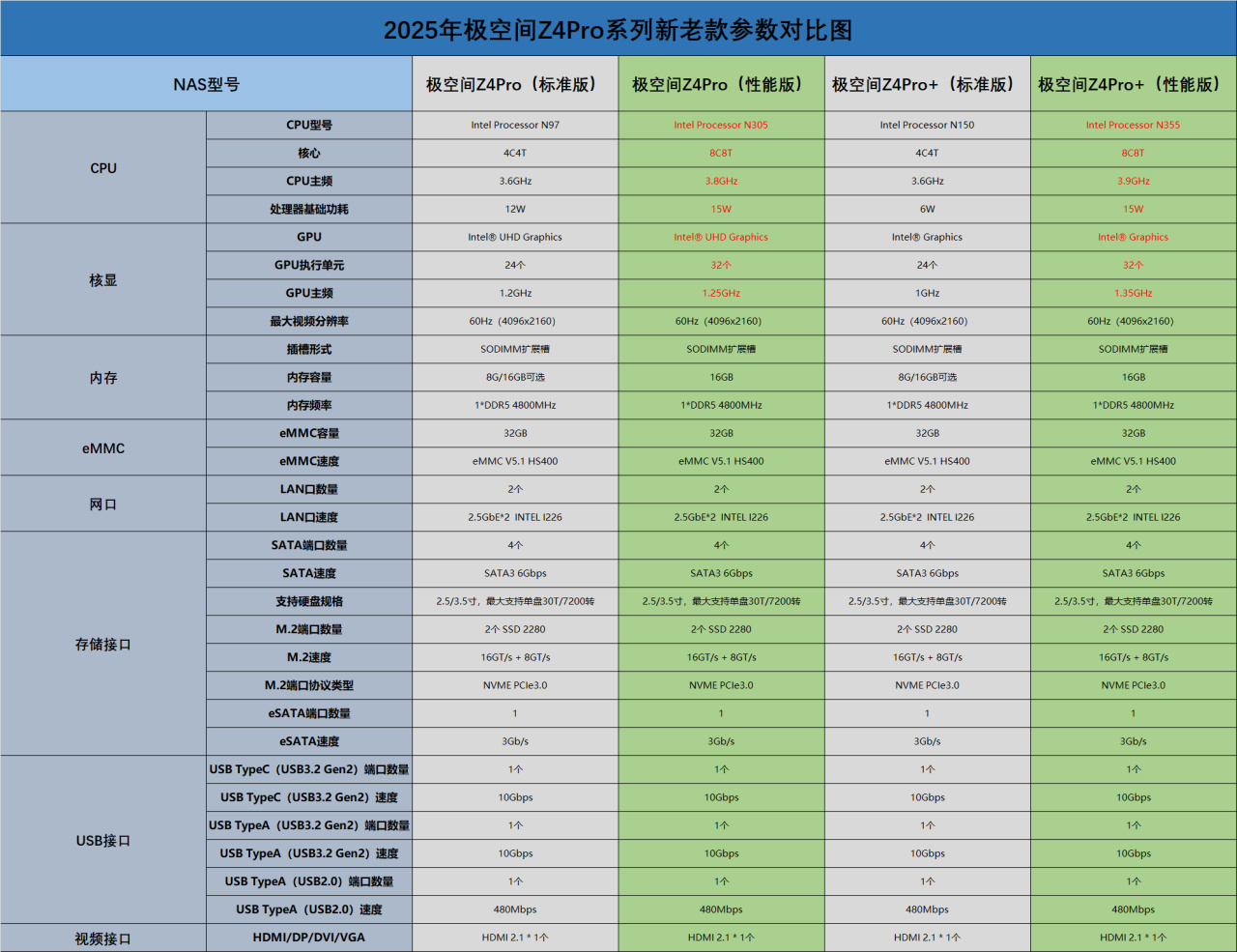 ● 主要區別在CPU上,老款極空間Z4Pro爲N97/N305,新款極空間Z4Pro+爲N150/N355。標準版的能耗比有提升,性能版則是單核主頻+核顯主頻有提升。
