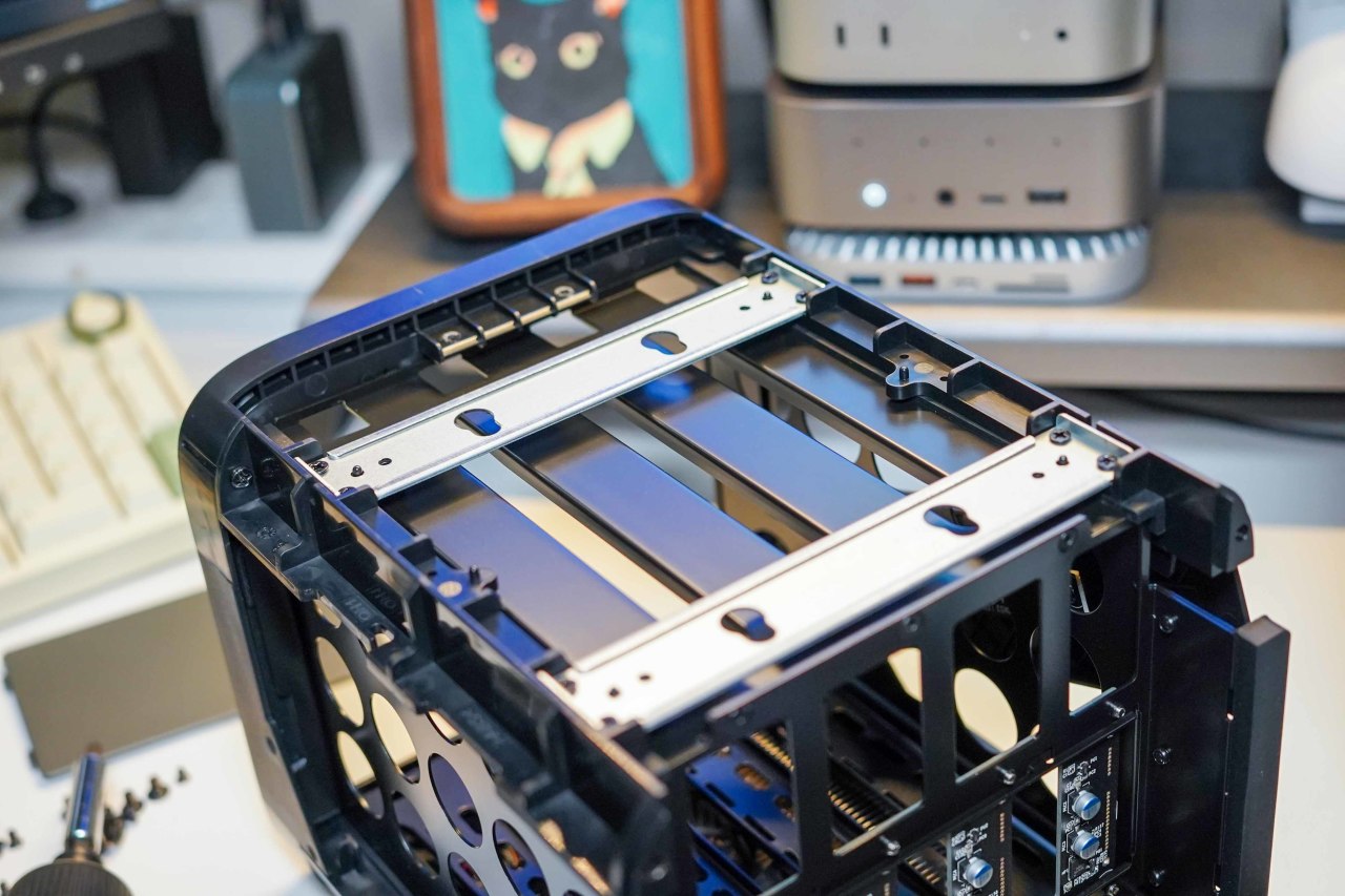 硬盤籠比較有意思,正面是極空間英文的Z開頭感覺,內部則是免螺絲設計,徒手就能安裝固定3.5英寸硬盤。