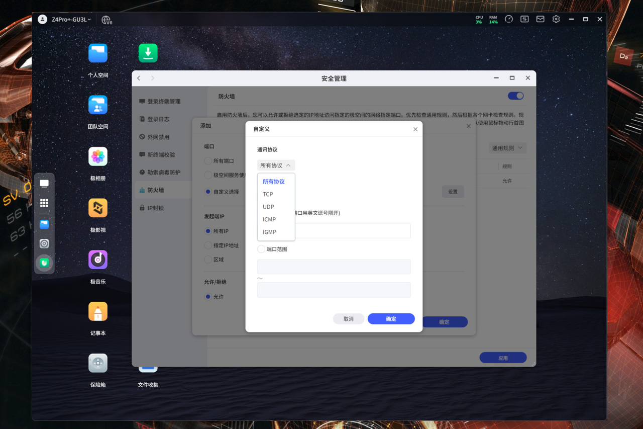目前極空間新版系統添加了防火牆功能,可以按照端口、傳輸協議或者IP維度配置訪問權限,對高階用戶用戶來說是個不錯的新增功能,老設備用戶還得再等等推送。
