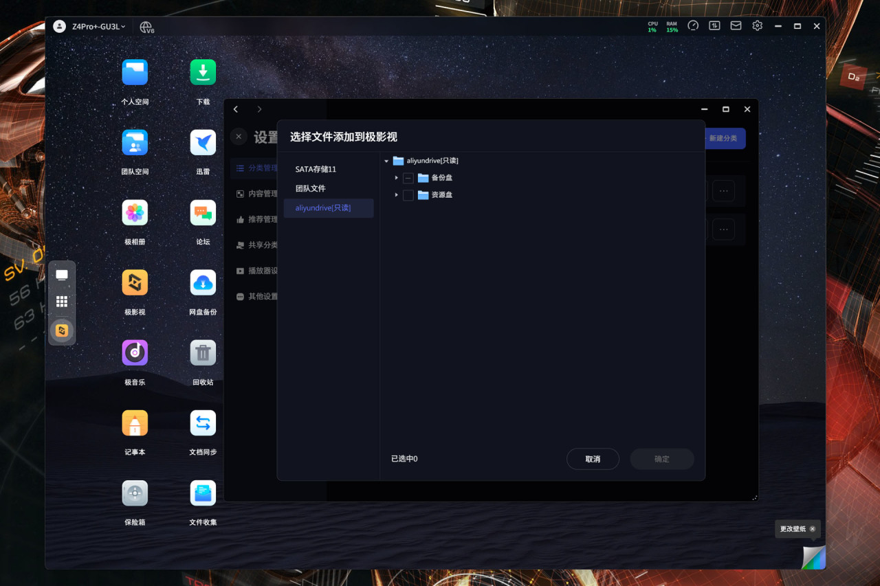 由於現在很多用戶爲了節約成本,會將電影等文件放在第三方網盤上不取回本地使用,極空間在個人空間頁面直接提供了掛載選項,由於是和阿里雲盤和115等網盤直接官方合作,所以掃碼就能掛載,完全不需要像羣暉那樣藉助第三方工具,能省不少功夫,同時安全性也有保障。