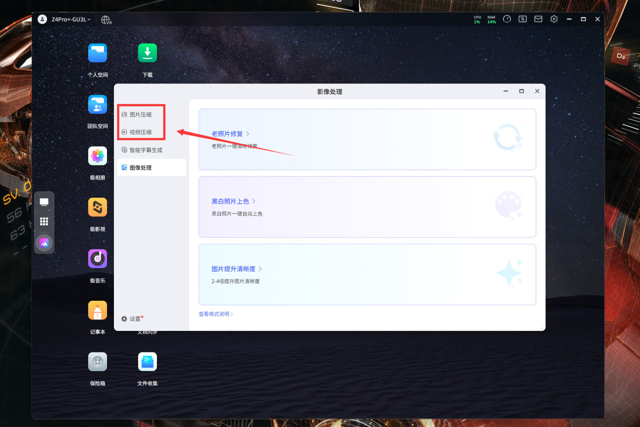 除了應用中心以外,極空間新老機型的內置軟件也會有細微區別,比如影像處理,極空間Z4Pro+多了圖片+視頻壓縮,這些高階功能太老的機型沒有,該升級還是升級吧。