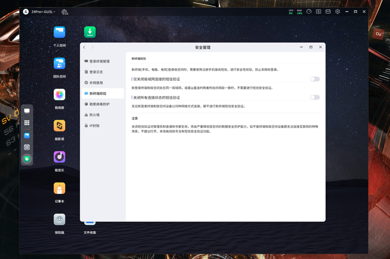 安防是極空間近期系統升級的重點,邏輯更偏向多用戶場景的本地維護,登錄設備封禁、IP封鎖和短信二級驗證這些機制都有,對常規用戶來說夠用。