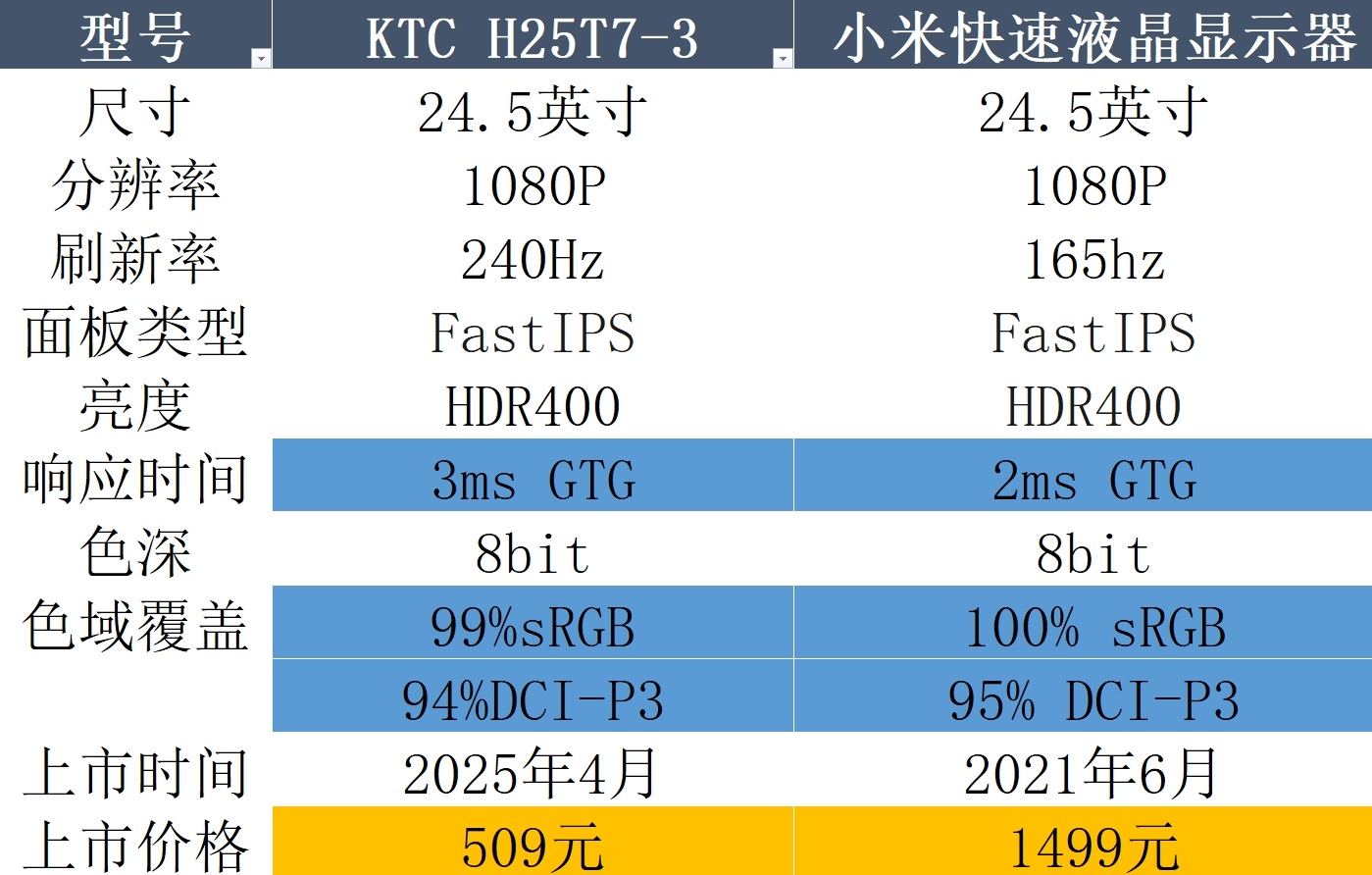 明顯小米這款在色域和響應時間上略微超過KTC的H25T7-3,但在幀率和價格上大幅落後。