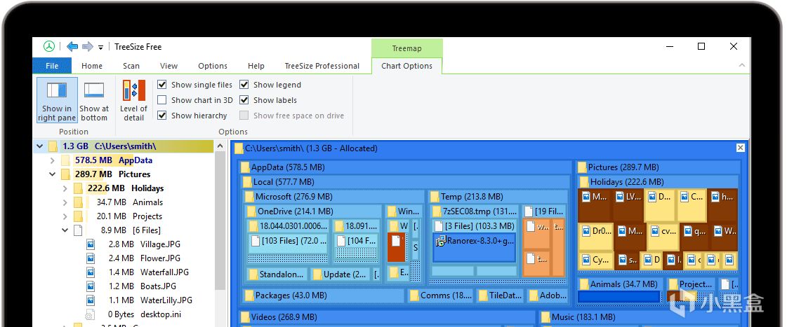 WizTree 可以非常轻松地从硬盘驱动器中找到和删除“Space hogs”。可视化树状图直观地显示所有文件的大小,帮助快速找到大型文件和文件夹,左侧可根据文件夹归类进行管理,右侧则是文件扩展名管理,下方则是用不同大小色块来直接进行展示,文件管理非常直观,还可以简单的自定义选项,简单方便,无广告无弹窗,推荐使用。