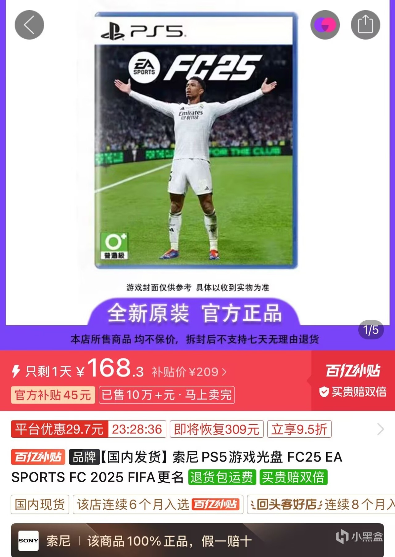 3.PS5游戏《FC25》港版中文168.3元全新包邮,上次推荐还是200多,年度足球游戏这么快就一下子到200元以下了,不知道是不是FC26快出了,商家都在出这货,想玩的朋友可以等到150全新再买。