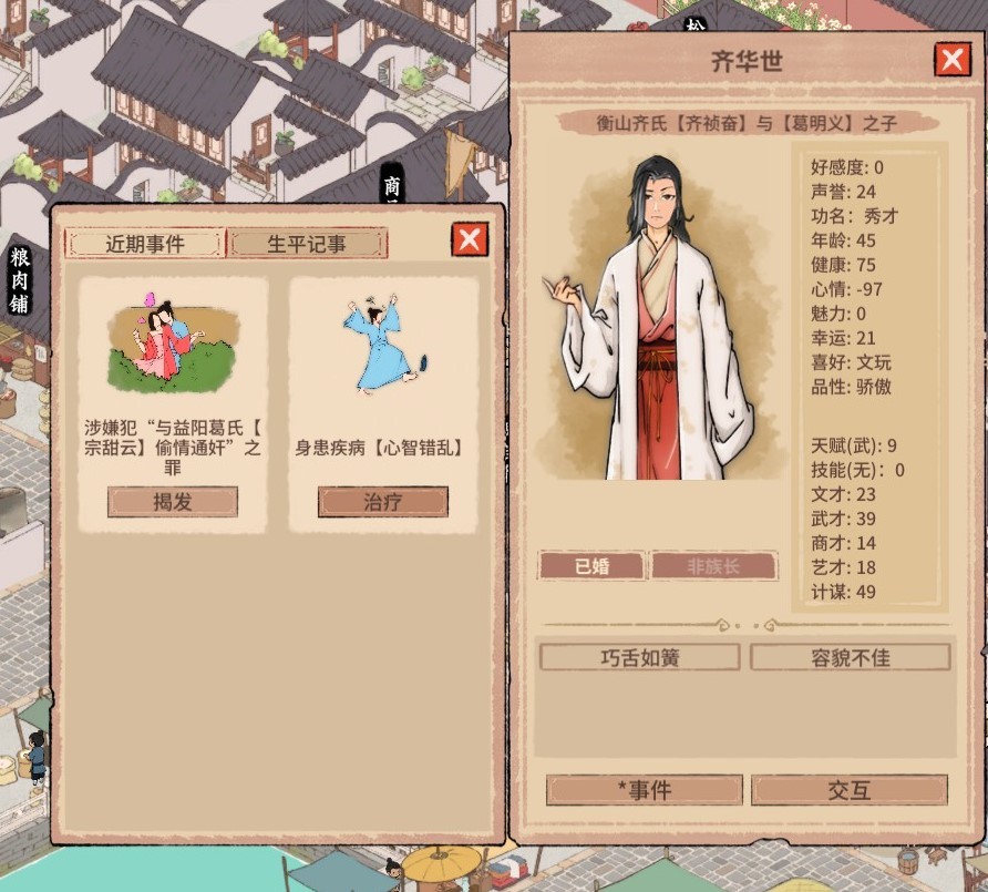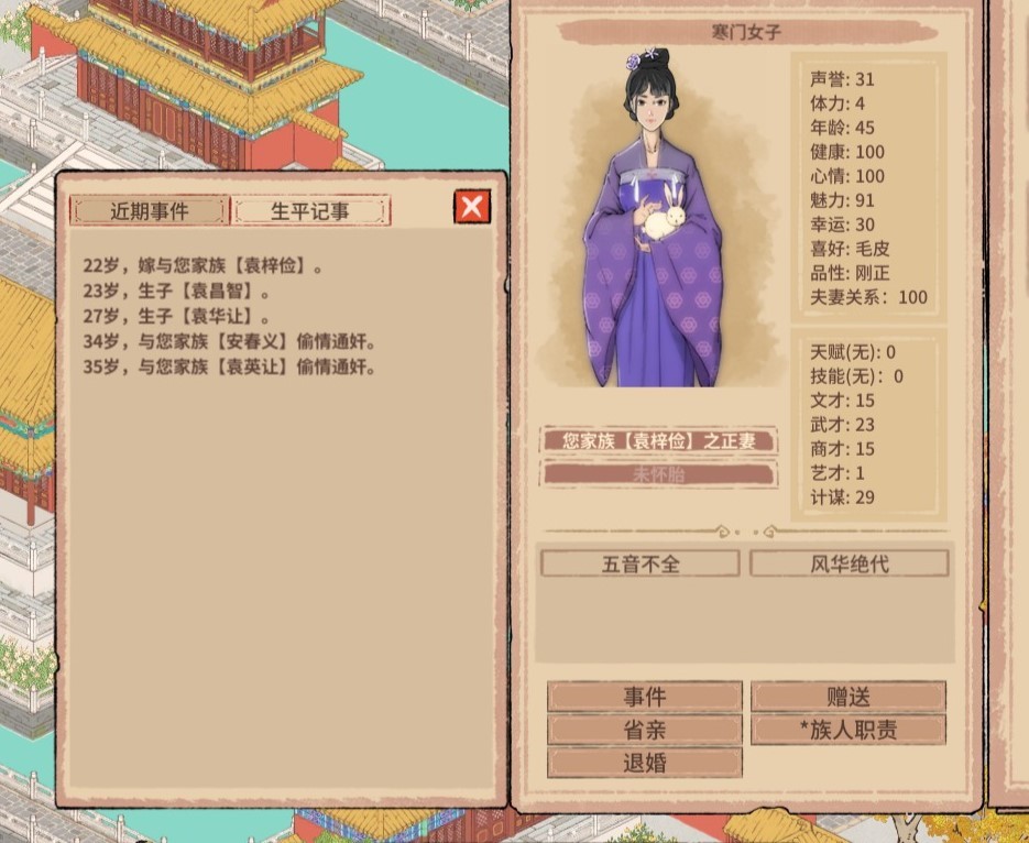 於是我前期滿大街看屬性好的門客,後期每個世家找適婚的青年才俊,只要數值高,上至80歲下至18歲都可以納入門下,徹底成爲不想讓自己家族血脈被玷污的“封建餘孽”。