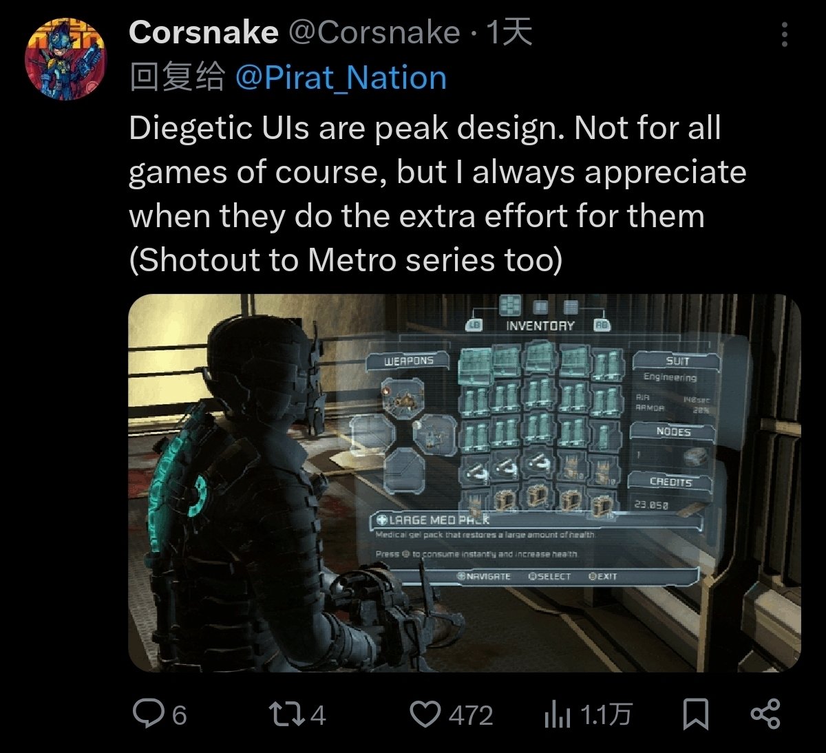 敘事UI是設計巔峯。當然,並非所有遊戲都如此,但我總是欣賞那些爲此付出額外努力的遊戲(比如《地鐵》系列)。