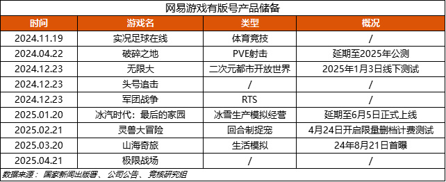 根据竞核统计,截至5月15日,网易游戏旗下已获发版号的在研产品大约有9款。其中包括开放都市世界RPG《无限大》、生活模拟经营《山海奇旅》、PvE射击《破碎之地》、回合制捉宠《灵兽大冒险》等。