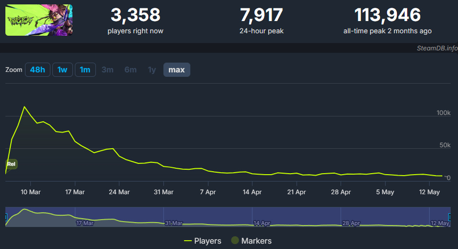 此外,今年3月上线的《界外狂潮》也遇到了不小的挑战。在上线初期迎来Steam同时在线玩家数超11万的峰值后,近期游戏相关数据表现疲软。