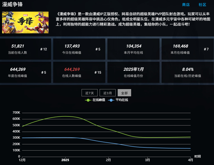 就比如《漫威争锋》,该作于去年12月上线后,迅速登顶Steam全球畅销榜,并在72小时内吸引超1000万注册用户,后续注册用户也突破了4000万。今年1月左右,《漫威争锋》在Steam平台的同时在线峰值更是超过了64万。不过,当前游戏在线用户数平均仅有15万左右。