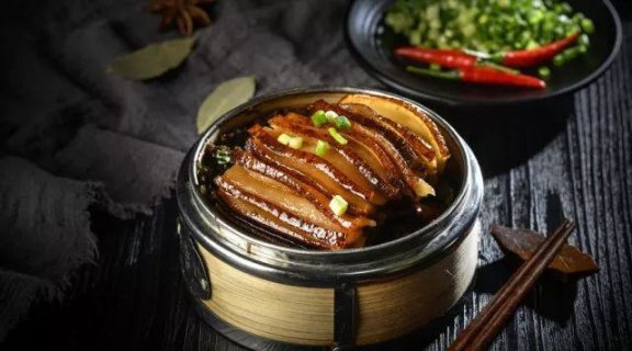 梅菜扣肉造型別致、大方得體,顏色醬紅油亮,湯汁黏稠鮮美,扣肉肥而不膩,食之軟爛醇香。梅菜色澤金黃,香氣撲鼻,清甜爽口,不寒不燥不溼不熱,它吸收了五花肉的油和湯汁,味道立即豐富起來,五花肉又帶着梅菜的清香,彼此互相配合。也因此名聲和做法傳遍全國。