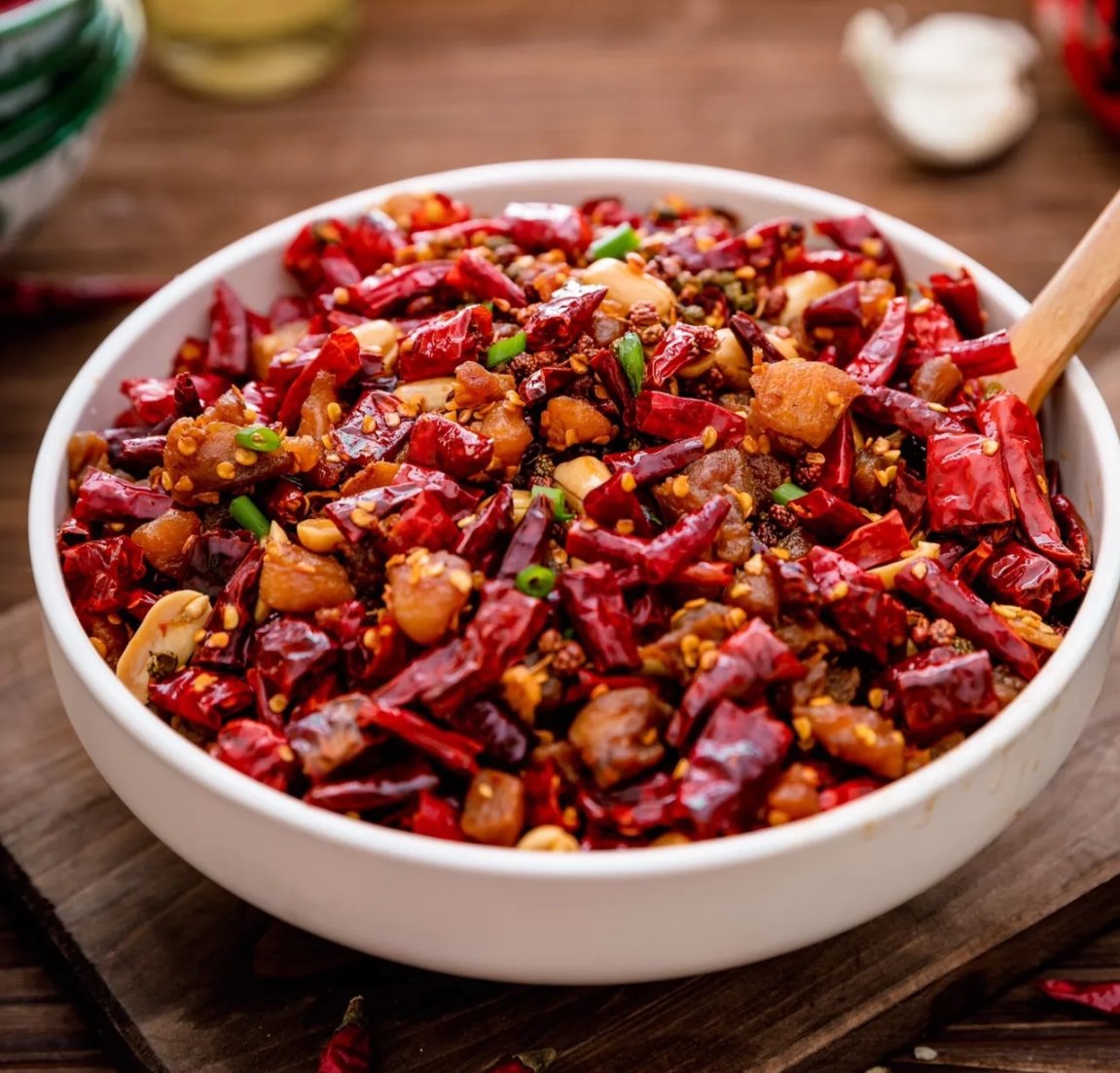 川菜第一道菜——辣子雞,堪稱川菜中的一大經典,它屬於川菜下河幫渝派的“辣子”系列。年夜飯上,最爲討喜的是代表喜慶元素的大紅色。而辣子雞的色澤棕紅油亮,看着就非常有食慾,也很有幾分喜慶的味道。這樣的菜一碗飯怕是不夠炫啊。