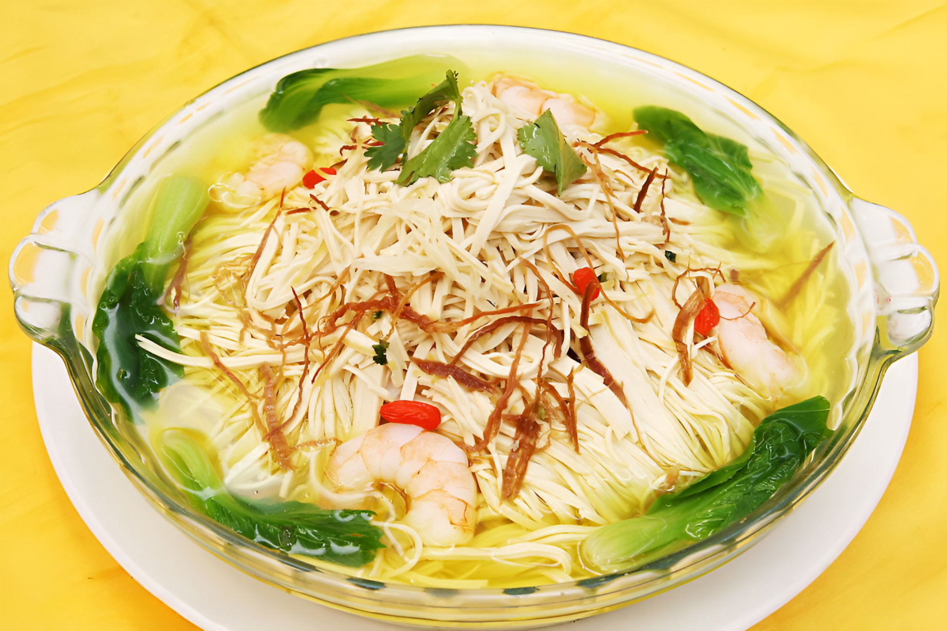 3、鍋中舀入雞清湯,放乾絲入鍋中,再將雞絲、肫、肝、筍放入鍋內一邊,加蝦子、熟豬油,置旺火燒15分鐘,待湯濃厚時,精鹽。加蓋再煮5分鐘,後離火,將乾絲裝入凹盤中,肫(雞胃,亦稱“胗”)、肝、筍、豌豆苗分放在乾絲四周,上放火腿絲,撒上蝦仁即成。