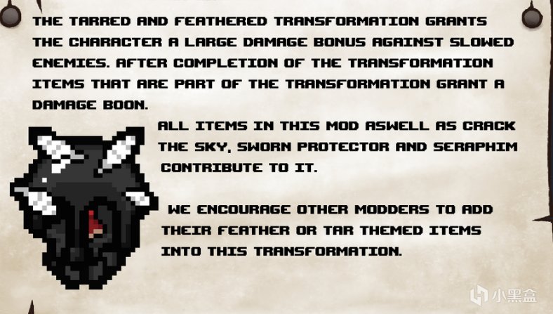通过拾取mod自带的所有道具(包括oozing skull)和原版一些带焦油和羽毛元素的道具(撕裂苍穹,宣誓守护者,撒拉弗)可以达成这个套装效果