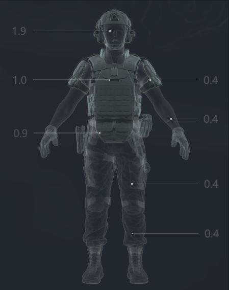 當子彈命中胸部時,會造成1倍傷害,腹部0.9倍。相對於四肢的0.4倍,這算是非常高的數值了。也因此,胸腹和頭部成了保護的重中之重。