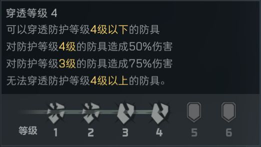 當子彈命中護甲時,會根據等級出現完全防護,減傷,完全穿透三種情況。