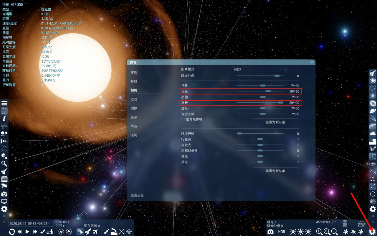 由于周围的天体多数都在银河系平面上,要找到一个合适的拍摄地点并没有那么容易。可以在设置中适当调整恒星和星云的星等,用右键调整视角的方式寻找拍摄地点。