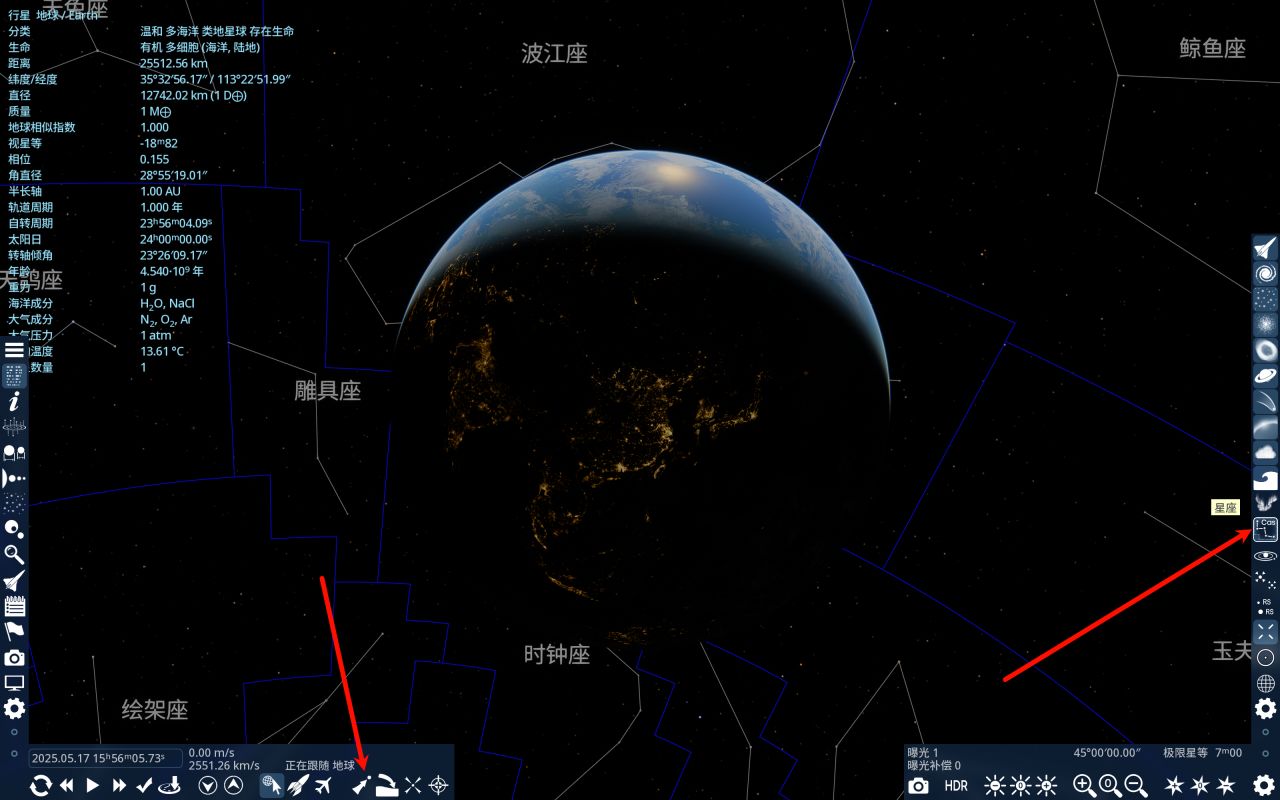 启用右侧边栏的星座。可以看到星座中相邻的天体被白色线条相互连接。