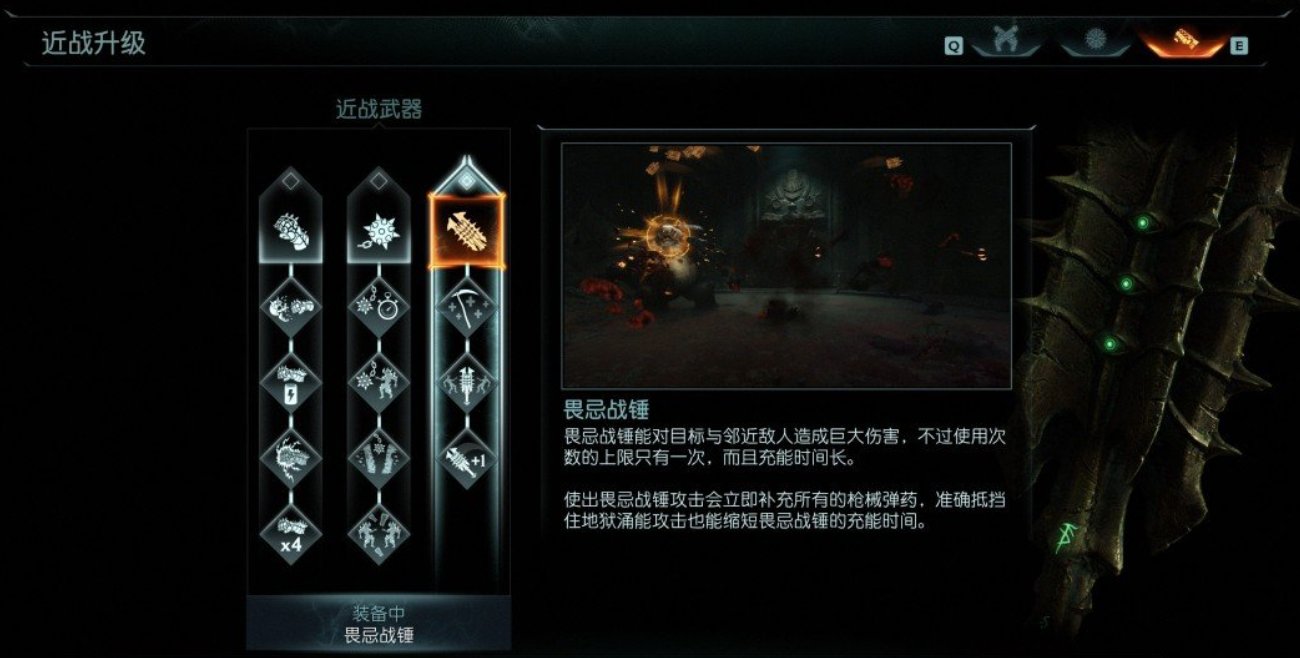 使出畏忌战锤攻击会立即补充所有的枪械弹药,准确抵挡住地狱涌能攻击也能缩短畏忌战锤的充能时间。