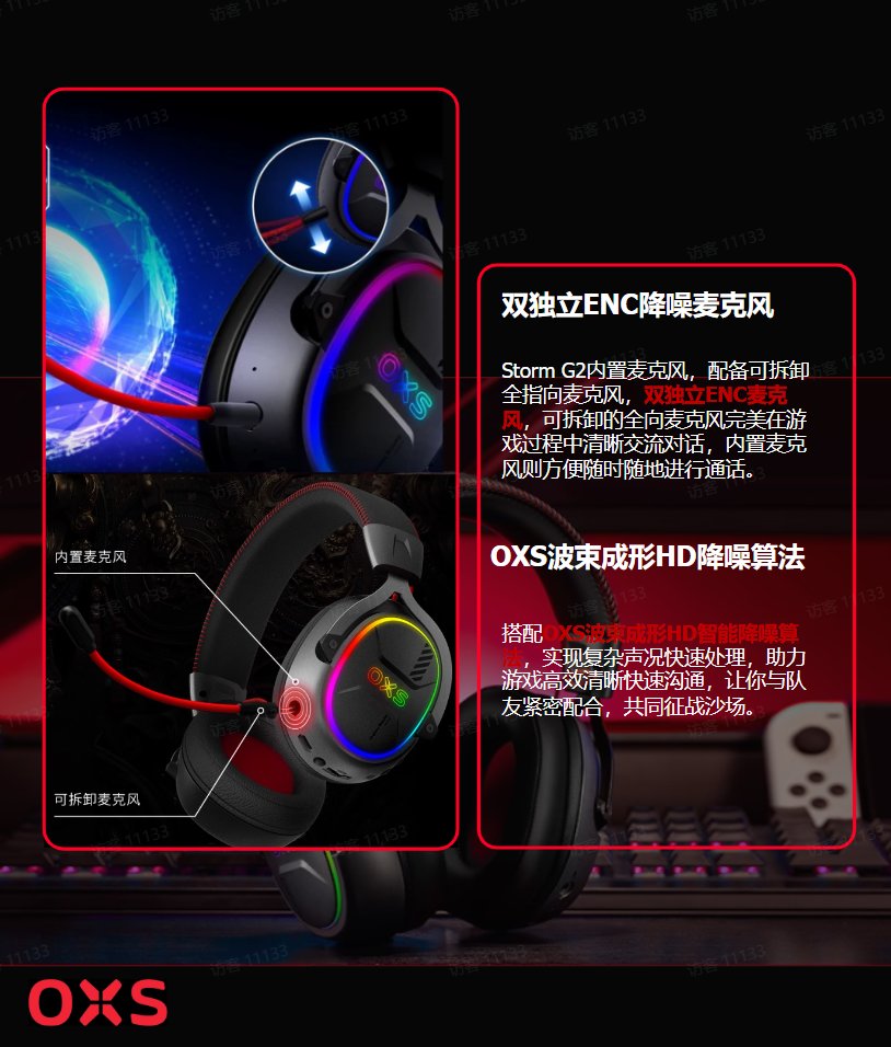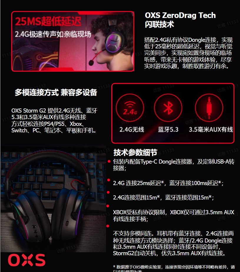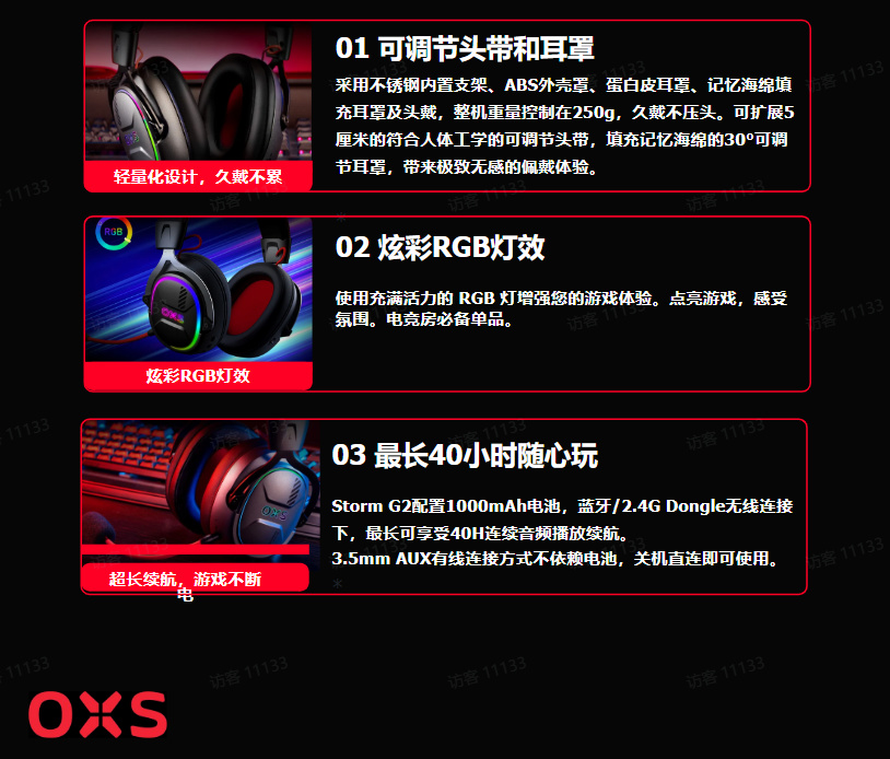 由于北通笔者也是用过很多年了,北通带给我的第一感觉就是帅,联名的整体设计更是尤得我心。而我第一次有机会接触的傲希来说,给我的感觉就是惊艳,以至于我开始怀疑我以前都是在用些什么耳机。在试玩的四个小时里,G2给我的佩戴体验是非常完美的,耳机架构采用不锈钢内置支架、ABS外壳罩、蛋白皮耳罩、记忆海绵填充耳罩及头戴,整机重量控制在250g,久戴不压头。可扩展5厘米的符合人体工学的可调节头带,填充记忆海绵的30°可调节耳罩,搭配绚丽的RGB灯效让笔者完全沉浸在了电竞的氛围中,以至于整个4个小时的游玩再反应过来时已经是工作人员只剩5分钟的时间提醒。耳机还配置1000mAh电池,蓝牙2.4G Dongle等多种无线连接,最长可享有40小时的超长续航。游戏,模式有此等神兵利器即使是一玩一整天也不会有任何烦恼了(具体参考P6.7.8.9.10)。
