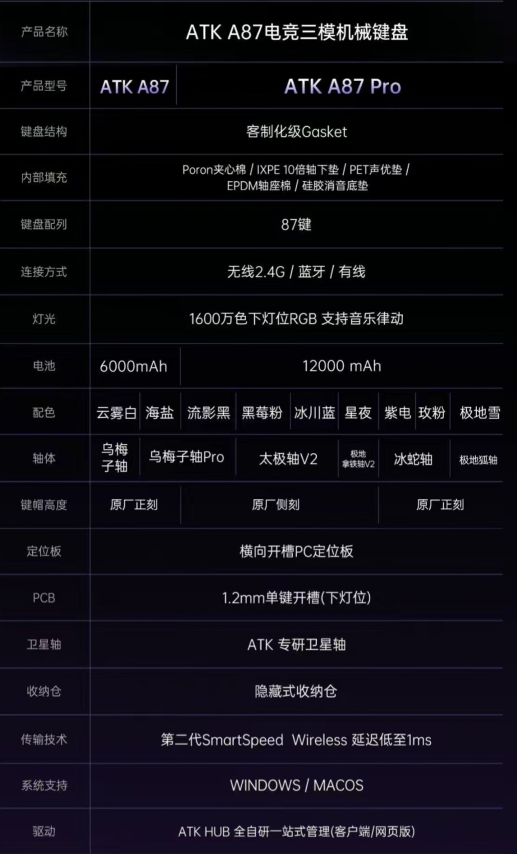 軸體方面,ATK A87提供了多種選擇,包括高特烏梅子軸Pro、旭華太極軸、環諾極地拿鐵軸、高特冰蛇軸、凱華極地狐軸等 。每一款軸體都經過出廠精潤,手感直逼客製化。