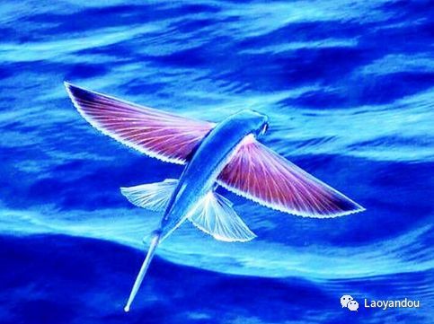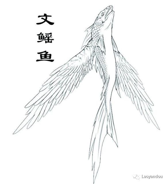 《山海经》译文:水中有很多文鳐鱼,形状像普通的鲤鱼,长着鱼一样的身子和鸟一样的翅膀,浑身是苍色的斑纹,却有白脑袋和红嘴巴,常常在西海行走,在东海畅游,在夜间飞行。