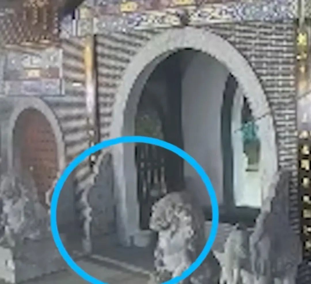 据监控视频显示,嫌疑人将庙里大门口台阶上放的一尊弥勒佛像用黑色塑料袋装走后绑在摩托车上带回了家中。