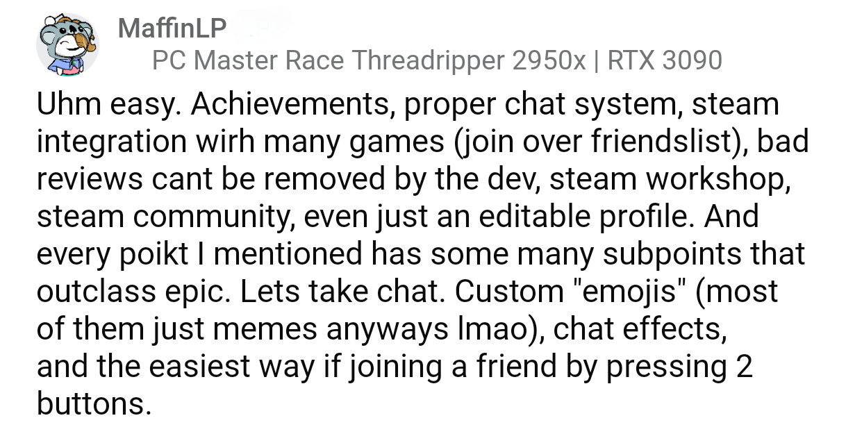 呃,简单来说,成就系统、完善的聊天功能、与多款游戏的Steam深度集成(通过好友直接加入游戏)、开发者可以移除差评、Steam创意工坊、Steam社区,甚至支持可编辑的个人资料,我说的每一点都包含许多细分功能,全方位碾压Epic。就拿聊天功能举例——自定义"表情包"(大部分其实就是梗图哈哈)、聊天特效,还有最便捷的"两步点击直接加入好友游戏"