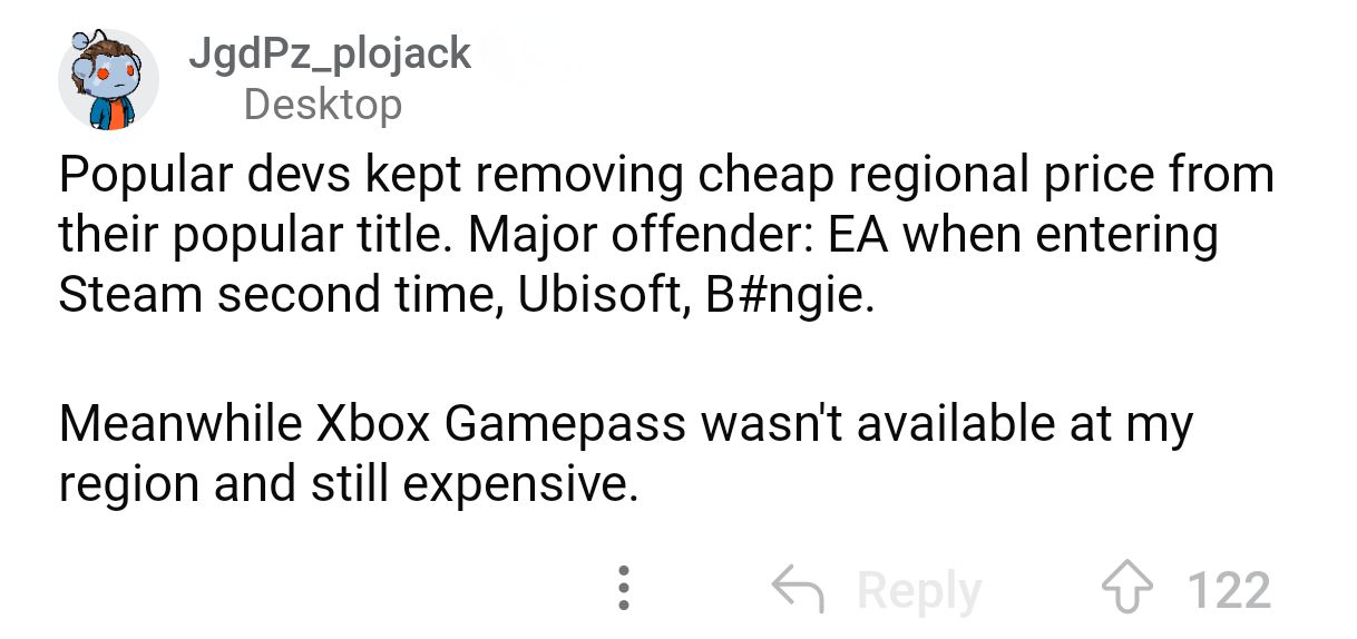 热门开发商不断从他们的热门游戏中移除低价区定价,主要典型:EA第二次入驻Steam时,育碧,棒鸡(Bungie)