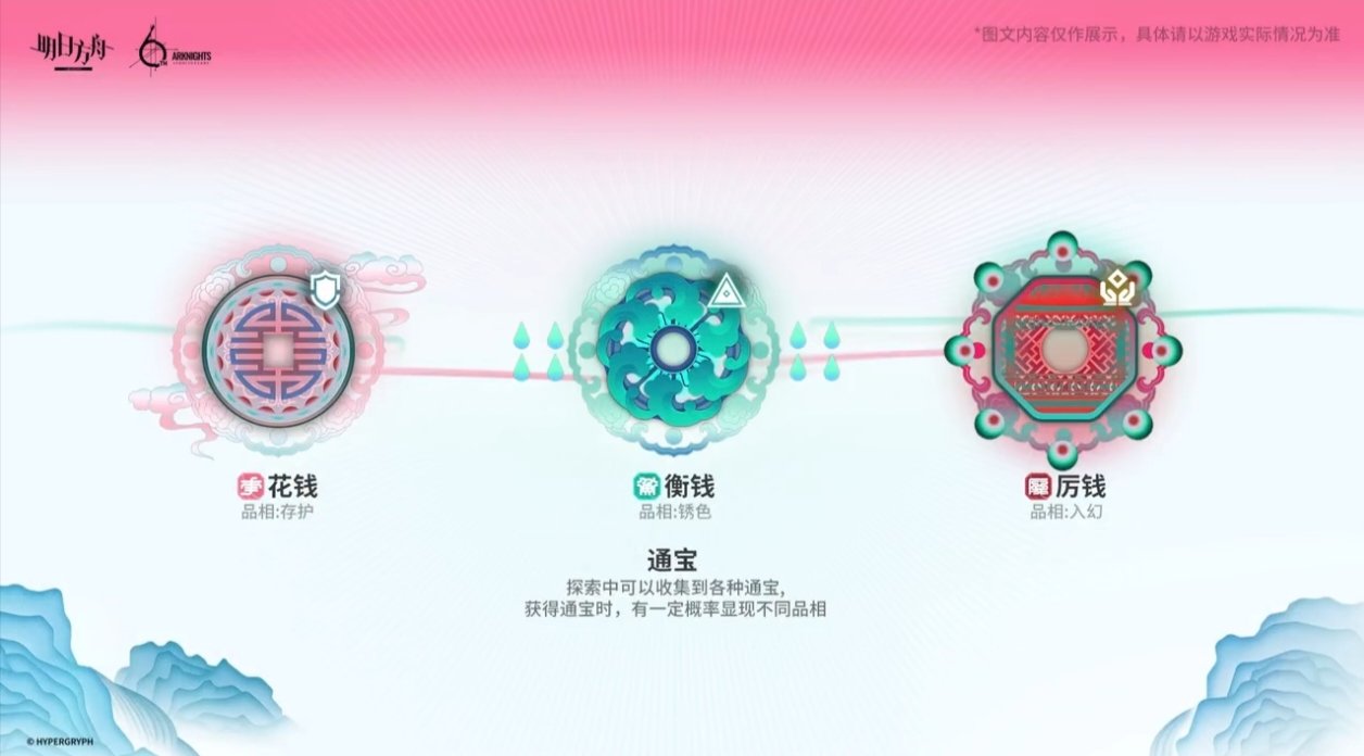 通寶收入【錢盒】之中,博士通過投錢來觸發效果,從錢盒中隨機投出三枚通寶,投出的通寶就可以在本層探索中一直生效,【錢盒】的容量有上限,博士可以將探索中新獲得的通寶加入【錢盒】然後替換原有的通寶,可自行搭配使用,通寶分爲花錢,衡錢,厲線三種類型,作用各不相同,品相也不同,在投錢時能額外獲得對應的資源獎勵(源石錠,護盾,希望),每當進入新的一層,將會自動往【錢盒】中投錢,投出的通寶隨之生效,部分事件中博士可以用投錢的方式一決勝負,從中獲得稀有獎勵,也可以消耗票券來重新投錢。