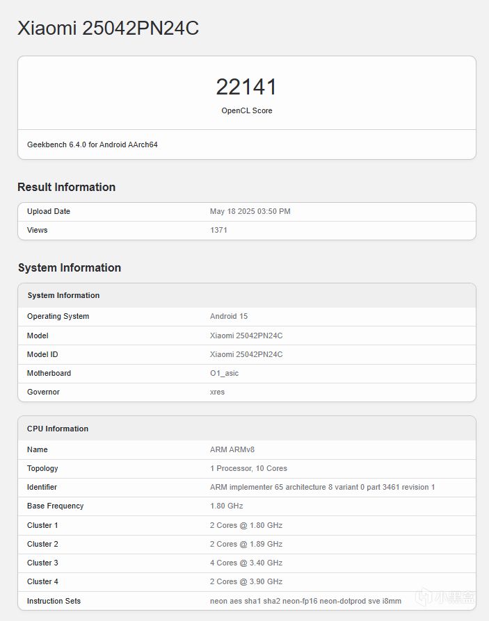 此次跑分搭載XRing O1的設備型號仍然爲“25042PN24C”,結合小米此前代碼庫信息及3C認證數據,推測爲即將發佈的小米15S Pro。芯片採用臺積電3nm工藝,爲十核異構架構,包含2顆1.80GHz核心、2顆1.89GHz核心、4顆3.4GHz核心及2顆3.90GHz超大核
